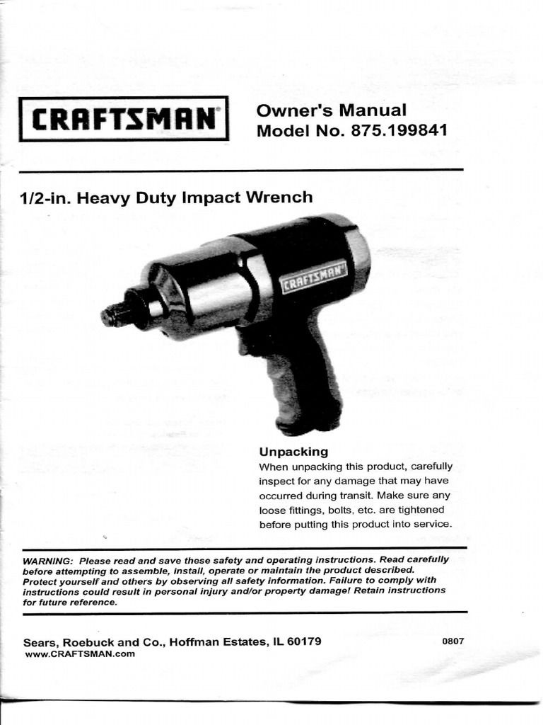 Craftsman Model 875 199841 Half Inch Heavy Duty Impact Wrench Manul Motor Oil Gas Compressor